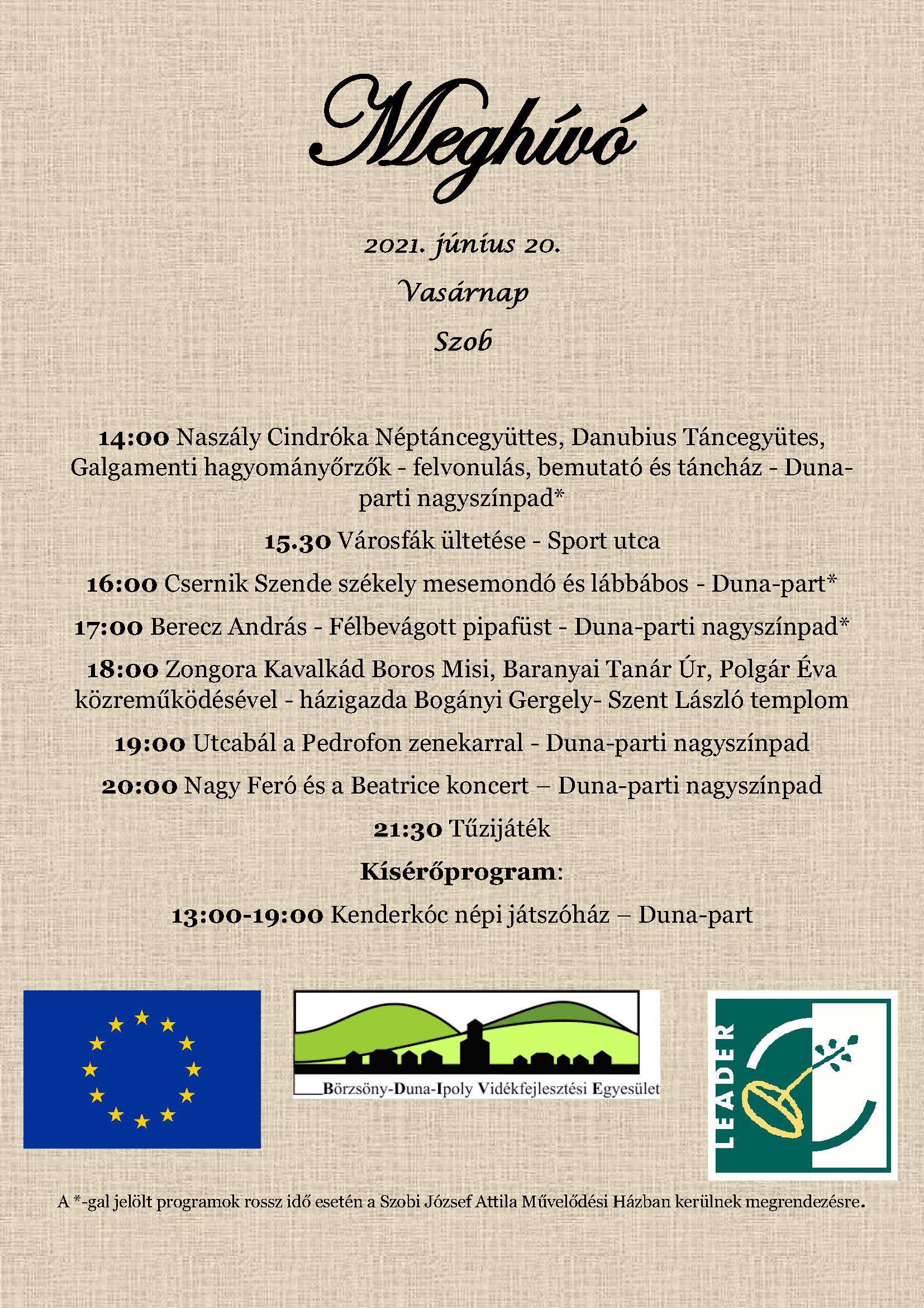 A Szobért - Szobiakért Közalapítvány szeretettel meghívja Önt és kedves családját a 2021. június 20. napján, Szobon tartandó Hagyományőrző és Összművészeti Napra. A részletes programtervet az alábbi meghívó tartalmazza.