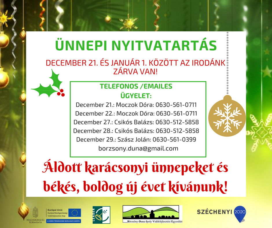 A Börzsöny-Duna-Ipoly Vidékfejlesztési Egyesület munkaszervezetének ünnepi nyitvartartása és ügyfél fogadási rendje.